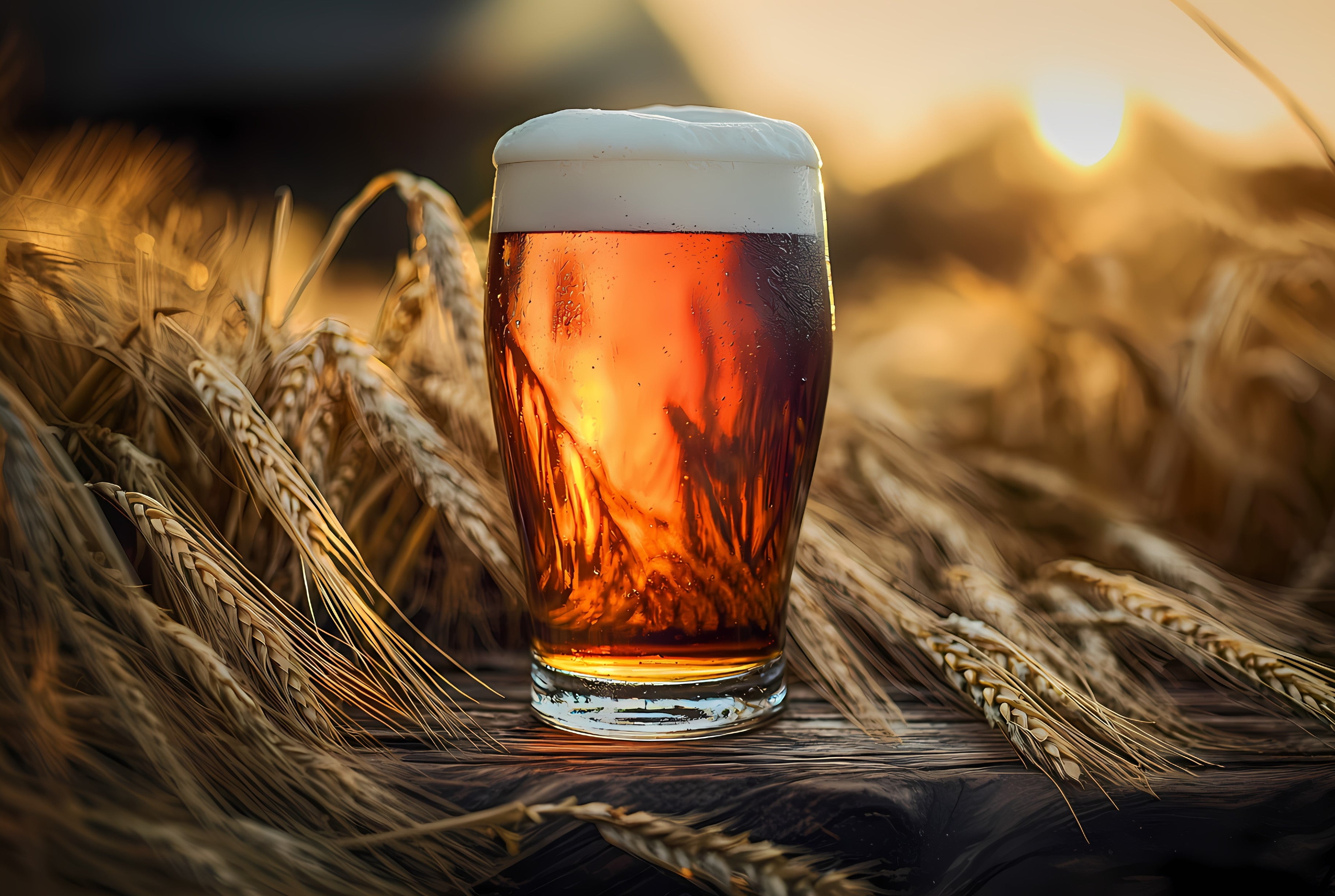 Rustikales Bierfass aus Holz mit Zapfhahn, daneben ein Glas frisch gezapftes, goldfarbenes Lagerbier mit Schaumkrone sowie ein Weizenbier im Hintergrund. Dekoriert mit Ähren, vor neutralem Hintergrund.